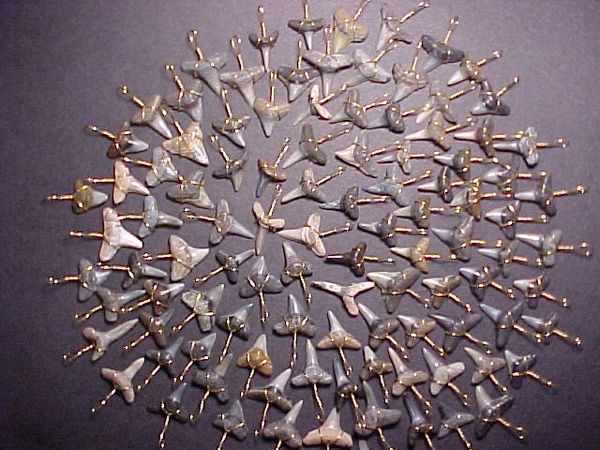 100 medium mix gold wrapped jewelry quality fossil shark's teeth. This collection of teeth shown in this picture are wrapped with our standard gold twist. You can customize your order by picking a favorite wrap style, see the wire wrap options page. Please specify when ordering.